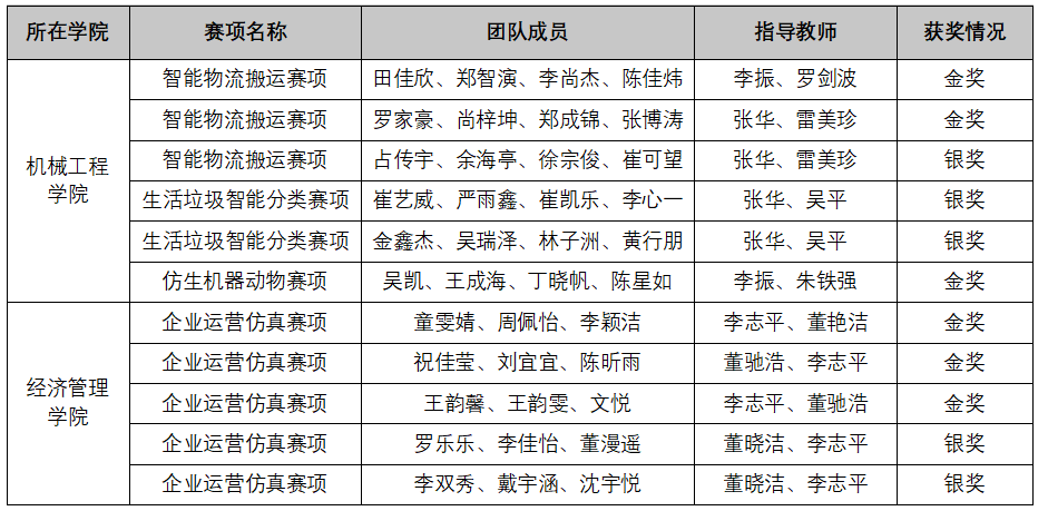 本次大赛共设“智能+”、新能源、虚拟仿真、工程创客专项四个赛道,涵盖七个赛项。浙江理工大学共派出11支队伍参赛,覆盖多个赛项,成绩斐然。具体获奖名单如下: